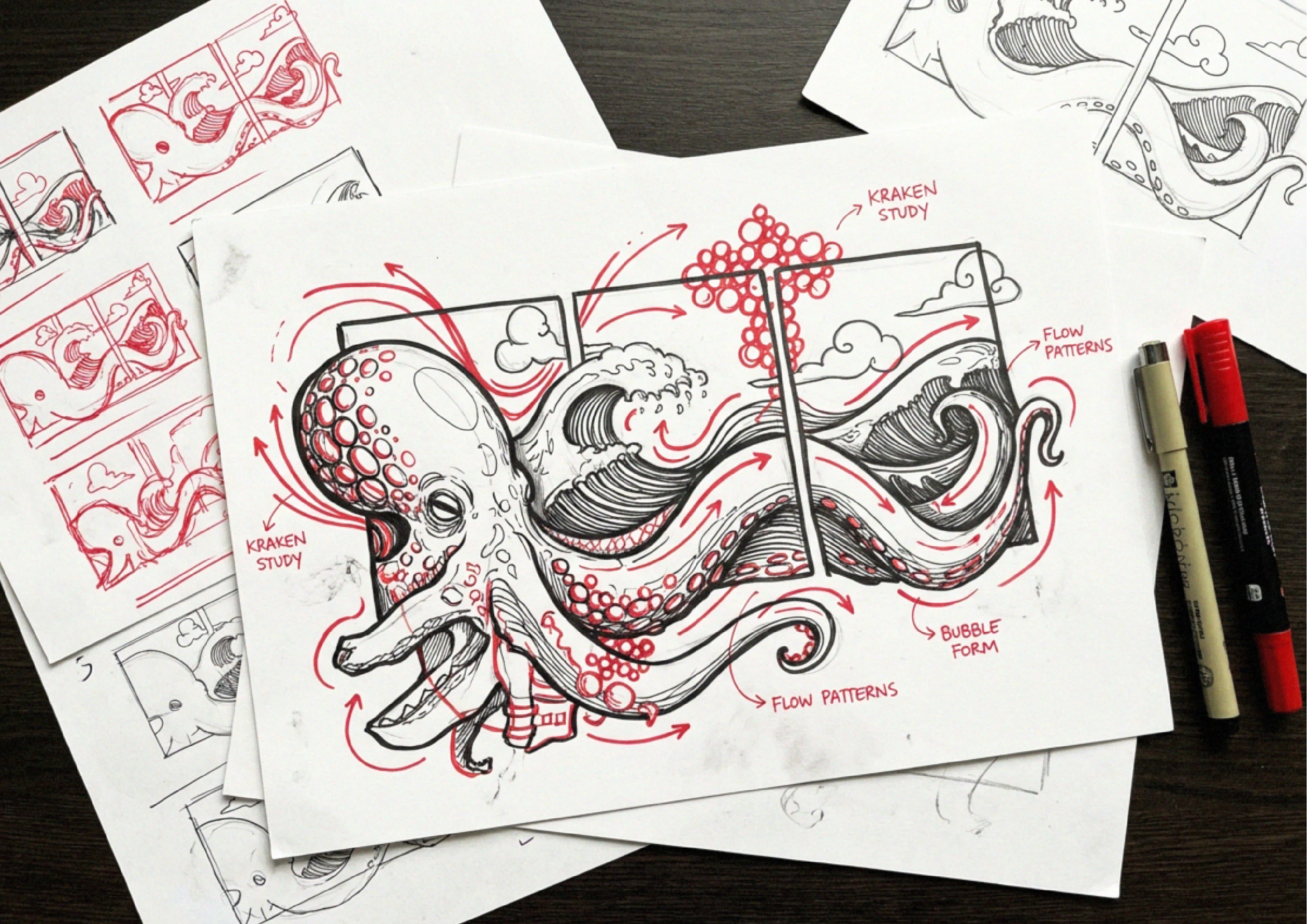 lines stayed imperfect, compositions felt slightly off-centre, and characters (kraken, typhoons, mythic creatures) were allowed to be strange rather than “on-trend cute.”